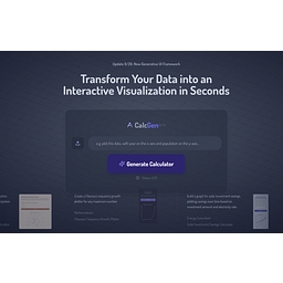 CalcGen is a tool that allows users to transform their data into interactive visualizations quickly. It provides various calculators and graph plotters tailored for different professions, such as finance, demographics, science, and more. Users can input their data and receive visual representations, making it easier to analyze and present information. The platform supports a wide range of use cases, from financial performance graphs to population comparisons and scientific calculations.